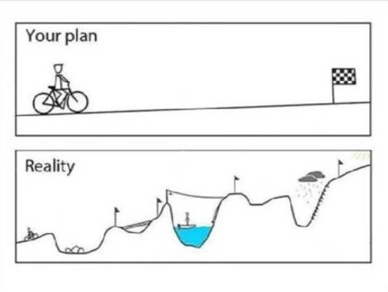 La vignetta mostra in alto come immaginiamo il percorso per raggiungere un traguardo futuro, in basso come realmente succede: alti, bassi imprevisti e tanti punti di arrivo intermedi.