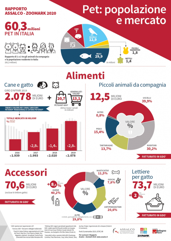 Iconografia del rapporto Assalco Zoomark 2020 del mercato del pet care nel nostro Paese.