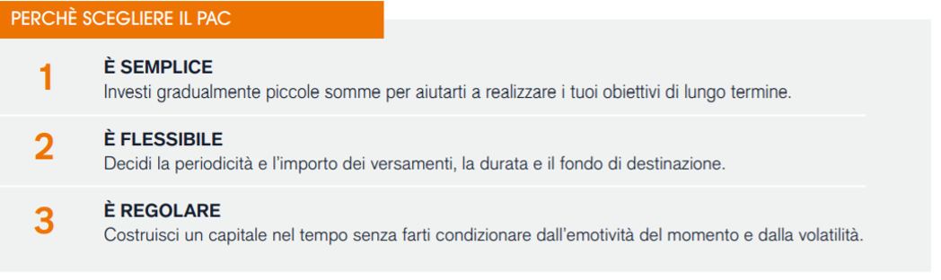 Il Piano di Accumulo del Capitale (PAC) è una modalità di investimento graduale che consente di investire periodicamente (anche piccole somme di denaro) in Fondi di investimento con lo scopo di costruire un capitale nel tempo e raggiungere i tuoi obiettivi finanziari. PAC - a piccoli passi verso il futuro