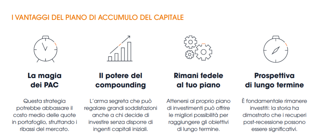 L’investimento tramite PAC ha l’obiettivo di mediare i prezzi di acquisto delle singole quote, limitando il market timing e riducendo il costo medio per quota nel tempo. In questo modo anche i ribassi del mercato possono rappresentare un’opportunità.