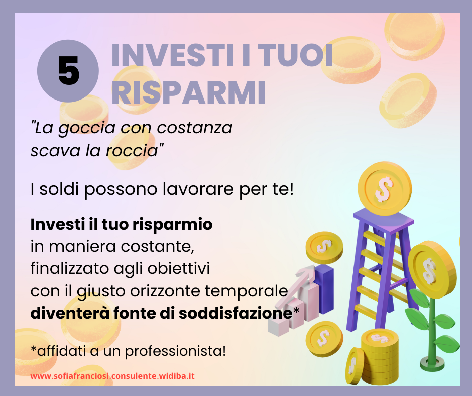 Ho sintetizzato 5 consigli per migliorare la gestione delle tue finanze e il livello del tuo benessere finanziario.