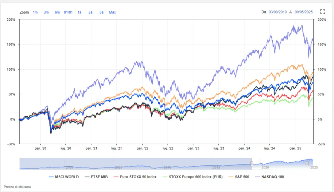 Un grafico aggiornato al 09.05.2025 dei principali indici mondiali (S&P 500, MSCI World, FTSE MIB, Euro STOXX 50 Index, STOXX EUROPE 600 Index e NASDAQ 100), con i principali eventi economici e geopolitici (inflazione in discesa, crescita USA ed Europa, guerre regionali, ecc.).