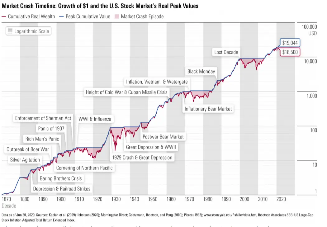 Il grafico mostra l'evoluzione dell'indice S&P 500 tra il 1870 e il 2020. (fonte Morningstar)
